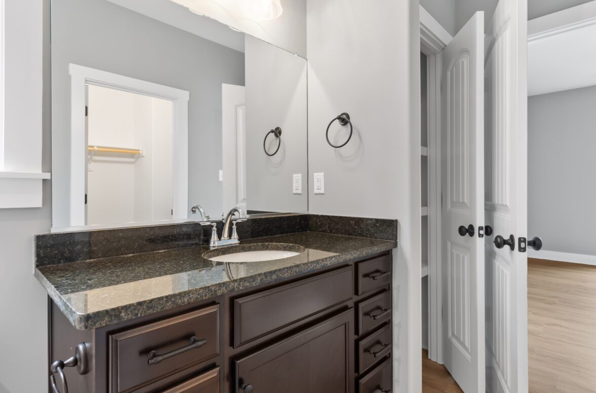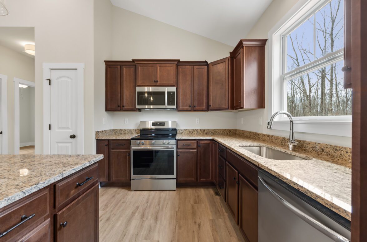Inside, the open layout feels bright and welcoming, with a cathedral ceiling in the great room that creates an airy, relaxed atmosphere—perfect for quiet evenings or gathering with family and friends. The kitchen sits at the heart of the home, featuring granite countertops, Merillat cabinetry, a central island, and a pantry that keeps everything close at hand.