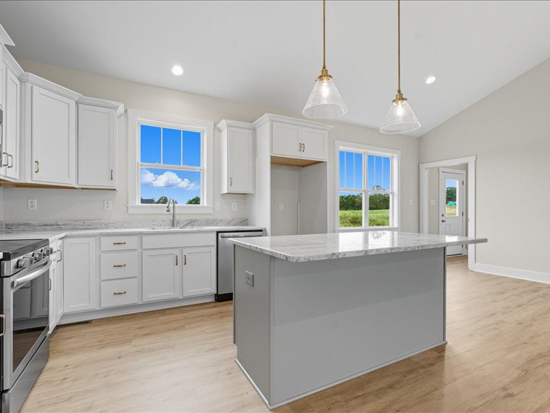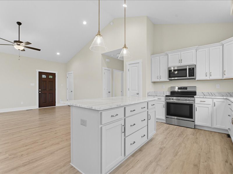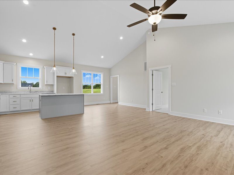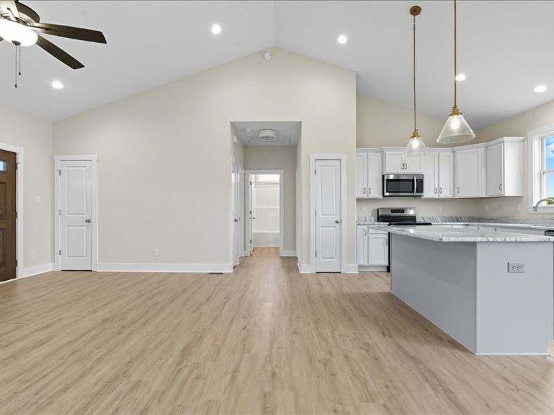 The OPEN FLOOR PLAN combines the kitchen, dining, & living areas into a spacious GREAT ROOM with a CATHEDRAL CEILING, perfect for gathering. The KITCHEN features GRANITE counters, MERILLAT CABINETS, a central ISLAND & a PANTRY. LVP FLOORING runs throughout the main living spaces.