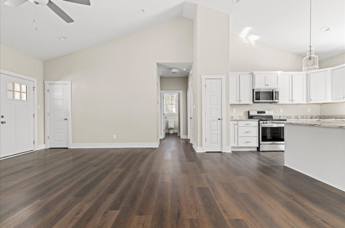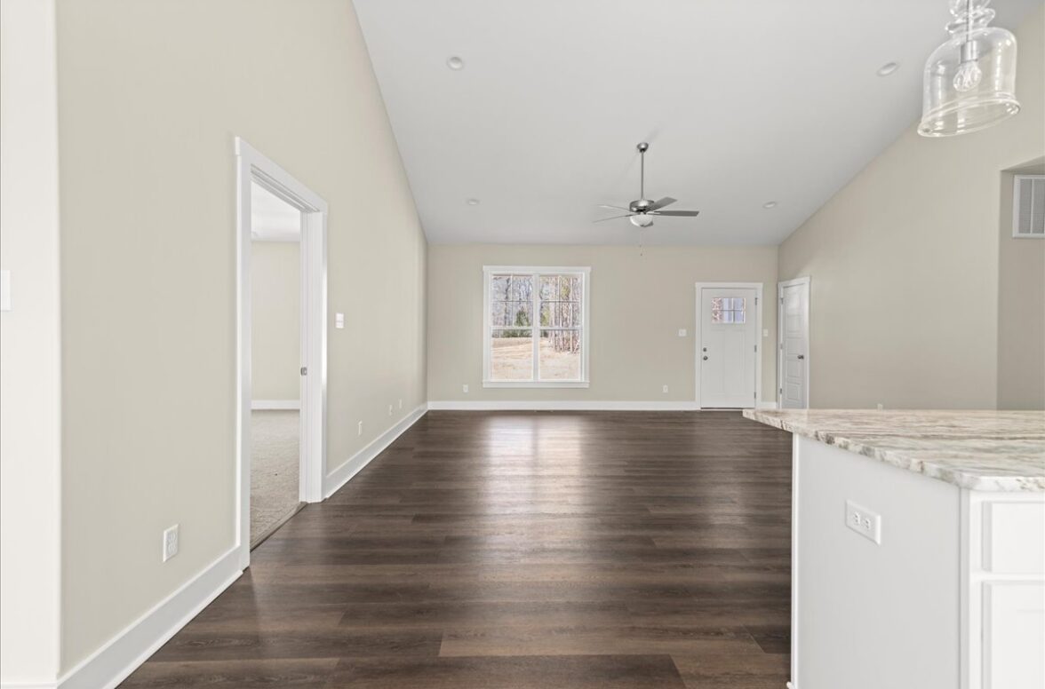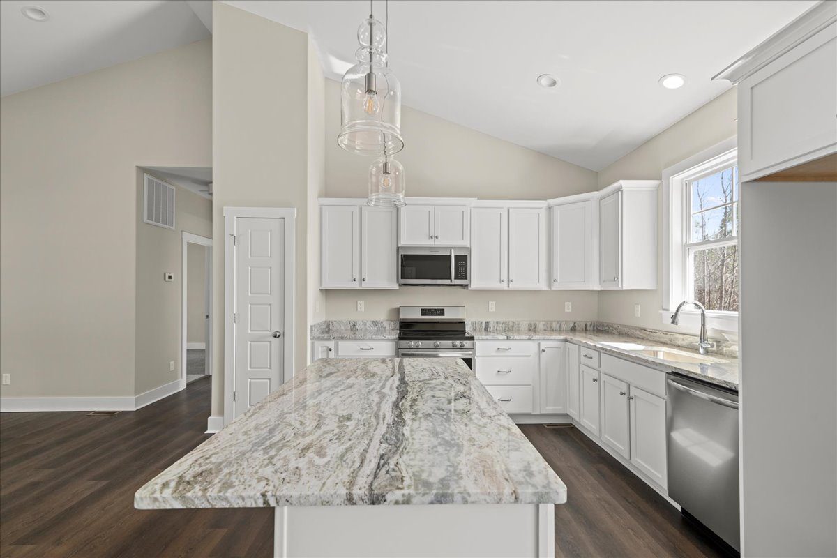 Set on nearly 5 acres, this beautifully designed Nottoway plan features 3 bedrooms and 2 bathrooms with a spacious, open layout ideal for modern living. The home offers cathedral ceilings and luxury vinyl plank flooring throughout the main living areas, with plush carpeting in the bedrooms for added comfort. The kitchen is equipped with granite countertops and stainless steel appliances, perfectly blending style and functionality.