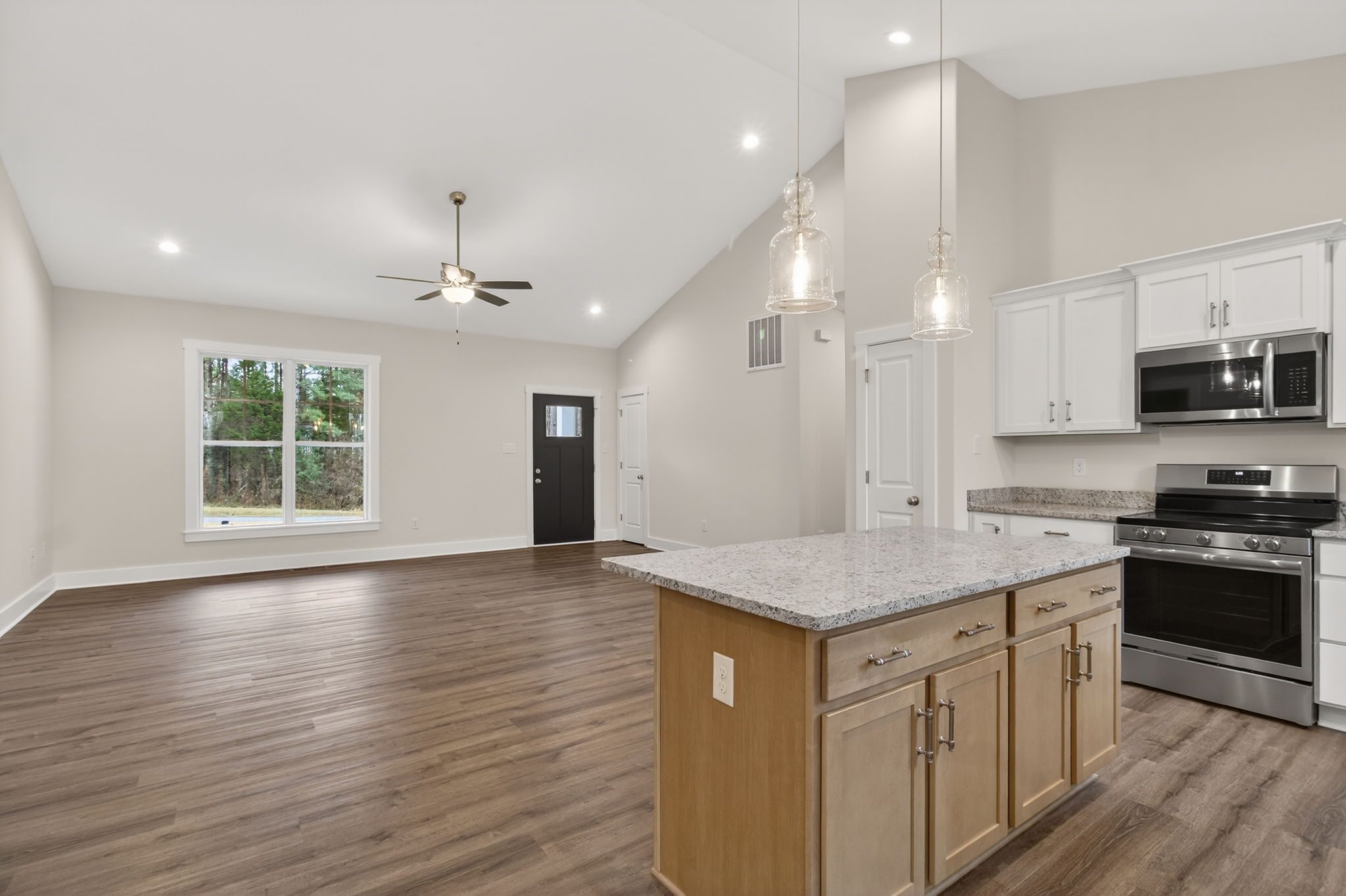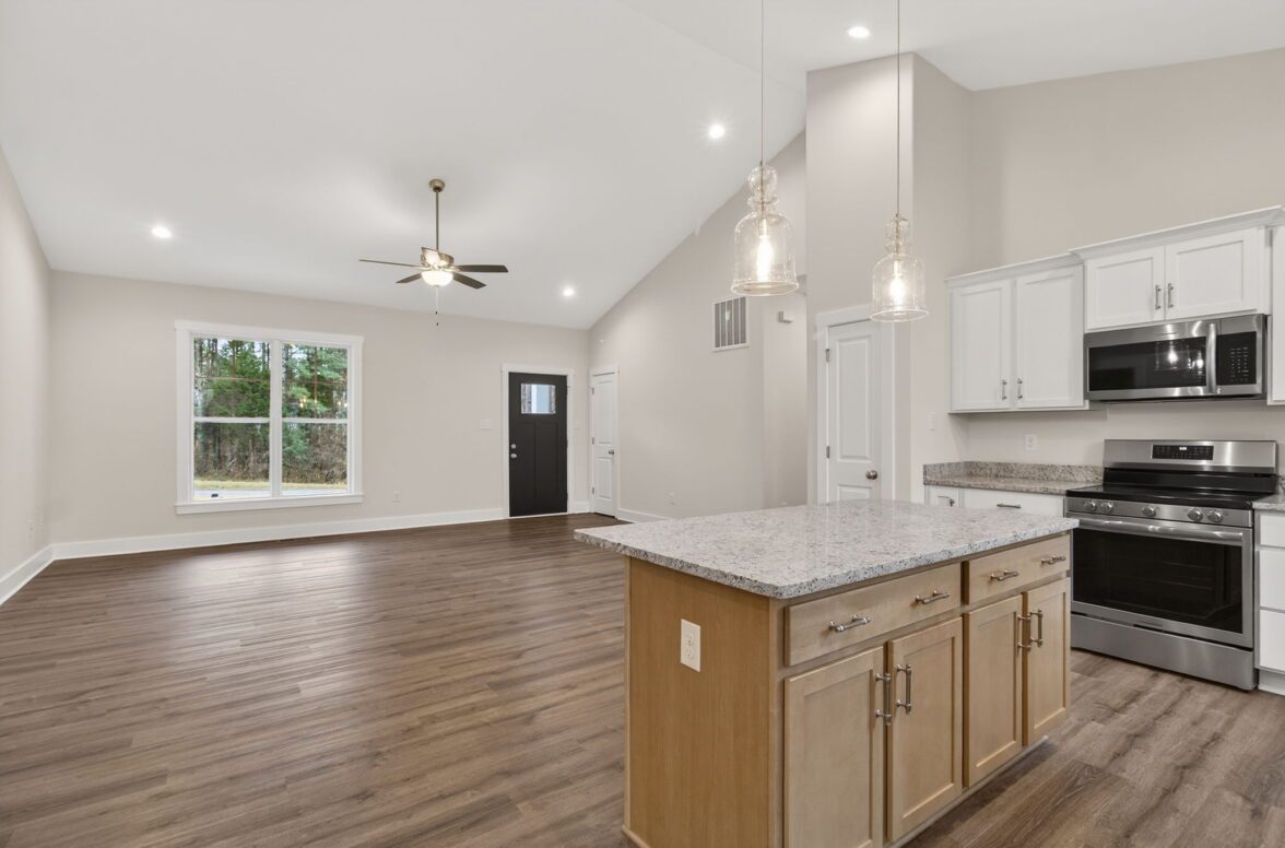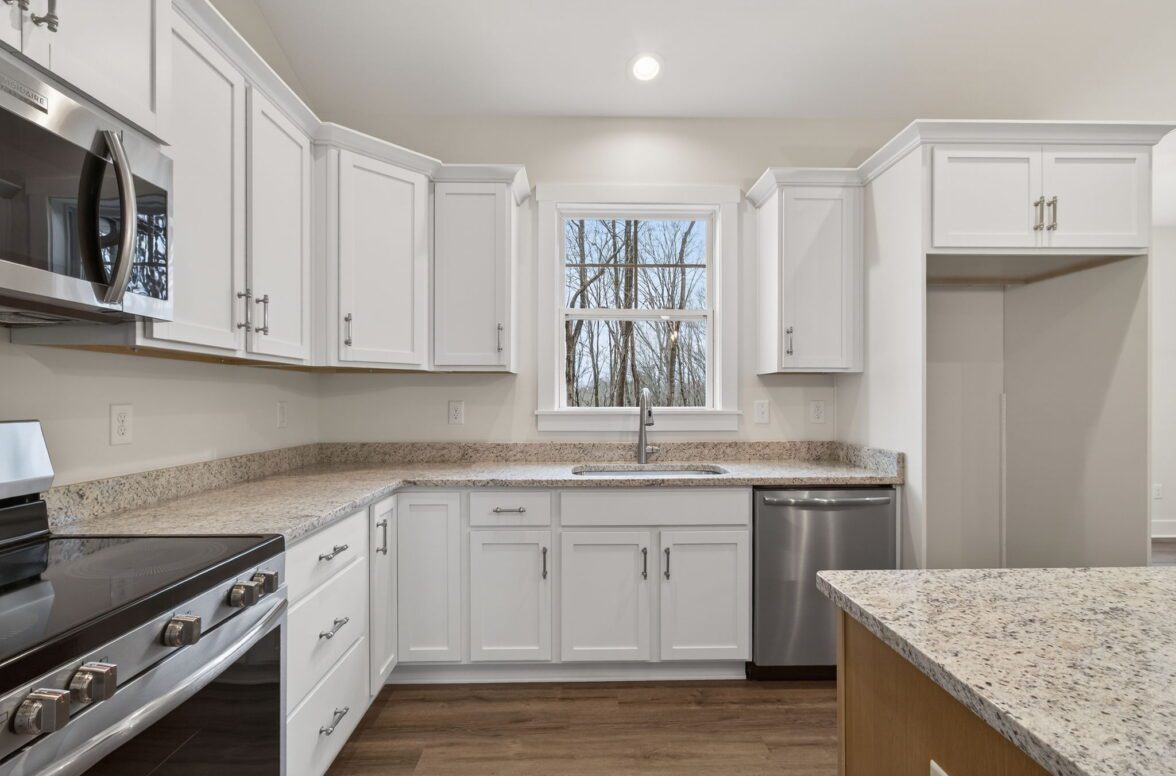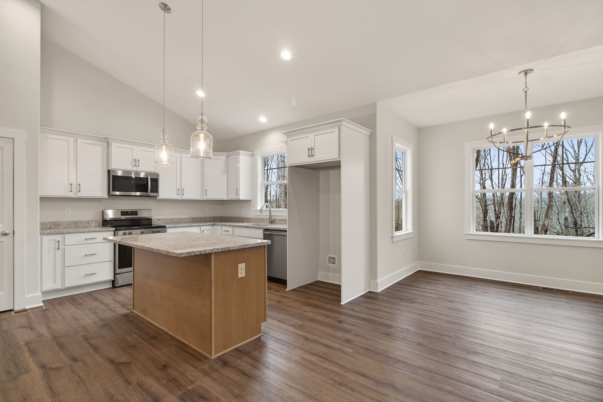 This stunning home includes granite countertops, a large kitchen island, Merillat cabinetry, and stainless steel appliances. The vaulted great room features cathedral ceilings and 9-foot ceilings run throughout the home, creating a spacious and airy feel. The thoughtfully designed mudroom includes a convenient drop zone bench, and the primary suite offers a walk-in closet and oversized shower. Exterior highlights include a covered concrete front porch and sidewalk, perfect for welcoming guests and enjoying the outdoors.